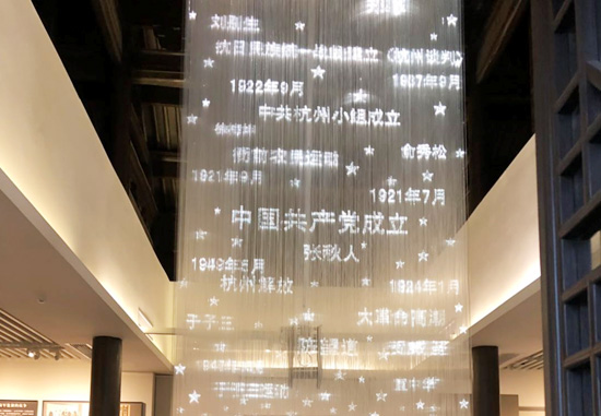 杭州党史馆有三个展厅,分别是“民族独立人民解放的杭州篇章”、“推进社会主义建设的杭州记忆”和“走特色社会主义道路的杭州实践”。 整个展馆科技感十足。一进门,巨大的白色梦幻光纤灯从屋顶垂落,如同一块电影荧幕,杭州90多年的重大历史事件经过投影后,一一显示。