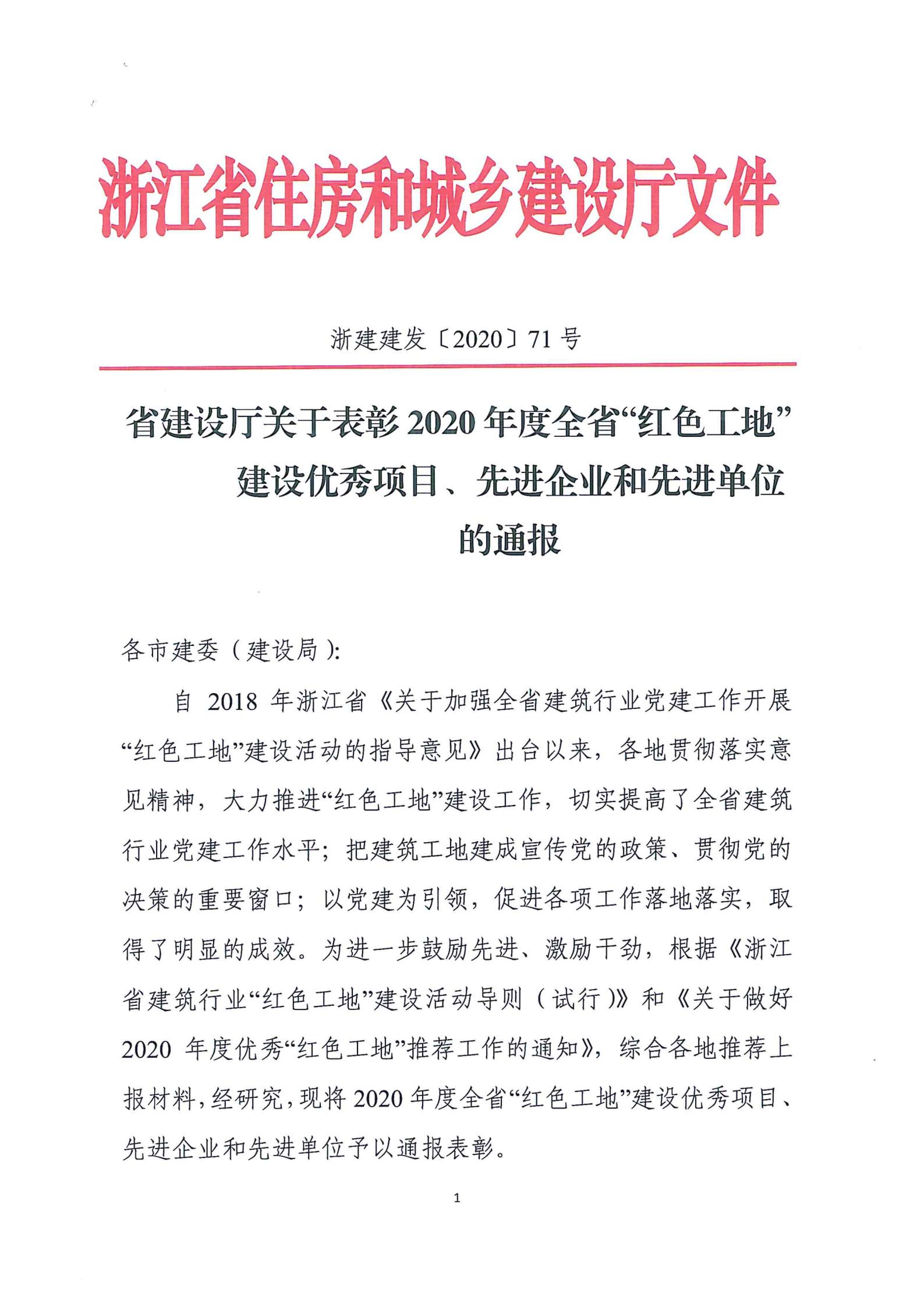 12月28日,浙江省建设厅通报表彰2020年度全省“红色工地”建设优秀项目、先进企业和先进单位,MILAN米兰体育·(中国)官方网站荣获全省“红色工地”建设先进企业称号,可喜可贺。