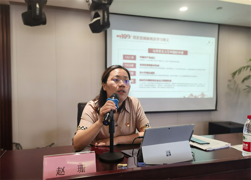 此次活动恰逢三丰建设集团党总支组织的每月固定党员活动学习日,西湖区妇联党组成员、副主席、区妇联机关支部书记赵珊为公司党员精心准备了主题为“学党史,守初心、勇担当”的党课,与大家一起回顾党史发展脉络及党的百年艰辛与辉煌。赵书记的党课结合工作实践,深入浅出,既深刻又生动,让集团党员在互动交流中引发思想共鸣,不忘初心,牢记使命。