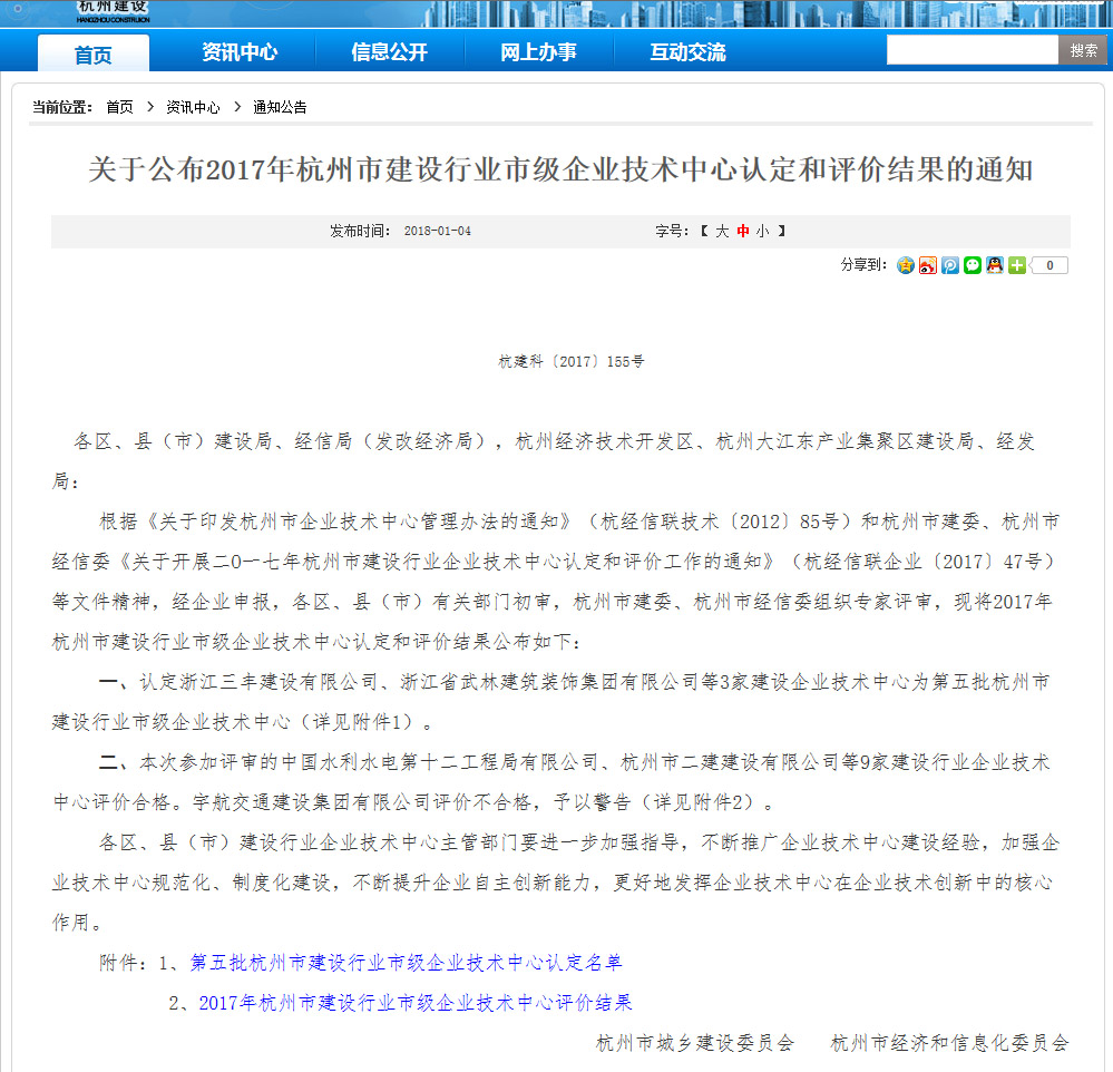 1月4日,杭州建设网公布2017年杭州市建设行业市级企业技术中心认定结果,我公司技术中心被杭州市城乡建设委员会和杭州市经济和信息化委员会认定为2017年杭州市建设行业市级企业技术中心。这是根据《关于印发杭州市企业技术中心管理办法的通知》(杭经信联技术〔2012〕85号)和杭州市建委、杭州市经信委《关于开展二O一七年杭州市建设行业企业技术中心认定和评价工作的通知》(杭经信联企业〔2017〕47号)等文件精神,经企业申报,各区、县(市)有关部门初审,杭州市建委、杭州市经信委组织专家评审、社会公示的结果,是对杭州市建筑业中技术创新能力较强、创新绩效显著、具有较好示范和导向作用的企业给予肯定。浙江三丰建设有限公司是2017年获评的三家企业之一。