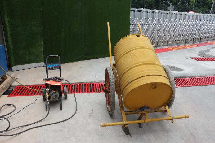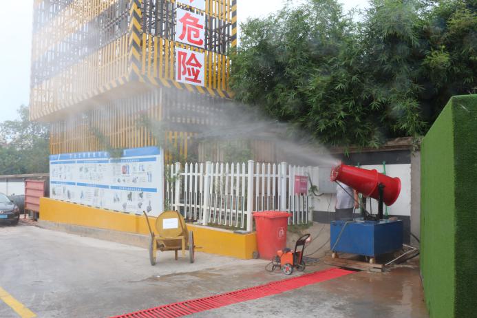 *施工出入口设置冲洗平台、高压水枪、雾炮、洒水车等冲洗降尘设施* |