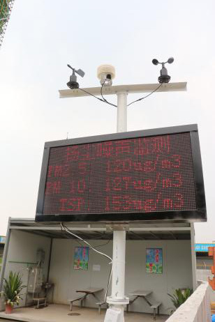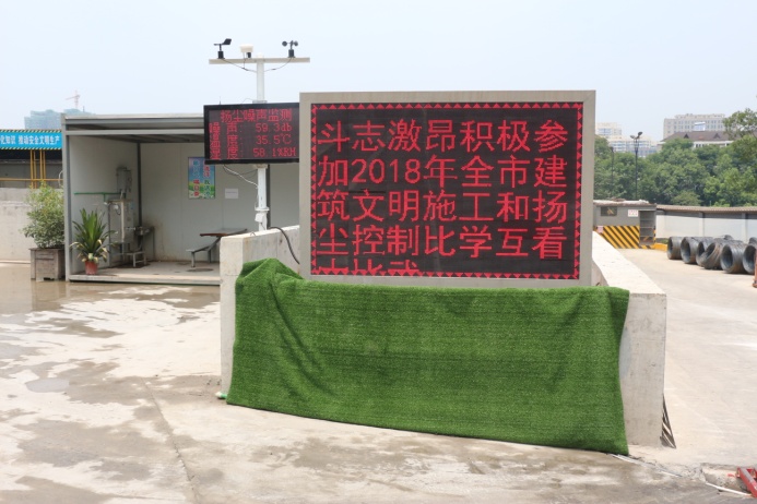 *大型LED显示屏滚动推送安全文明宣传标语,PM2.5监测设备实时监测各项空气及噪声指标,并与自动喷淋系统及企业物联网平台联动联网* |