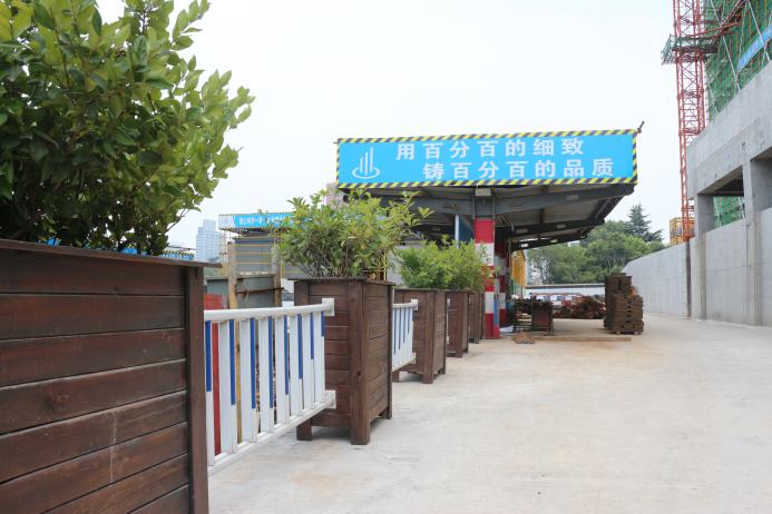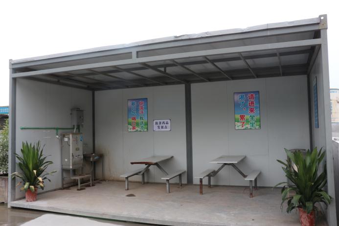 *施工现场设置定型化茶水亭,提供茶水及防暑药品,场内栽植花木,围挡张挂丰富多彩的宣传展板,为工人营造温馨、美丽、和谐的工作生活环境* |