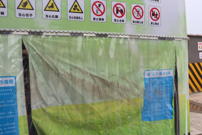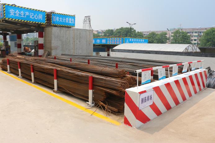 *钢筋等材料堆场材料堆放整齐,标牌齐全,砂浆桶封闭到位,出料口设置塑料防扬尘挂帘* |