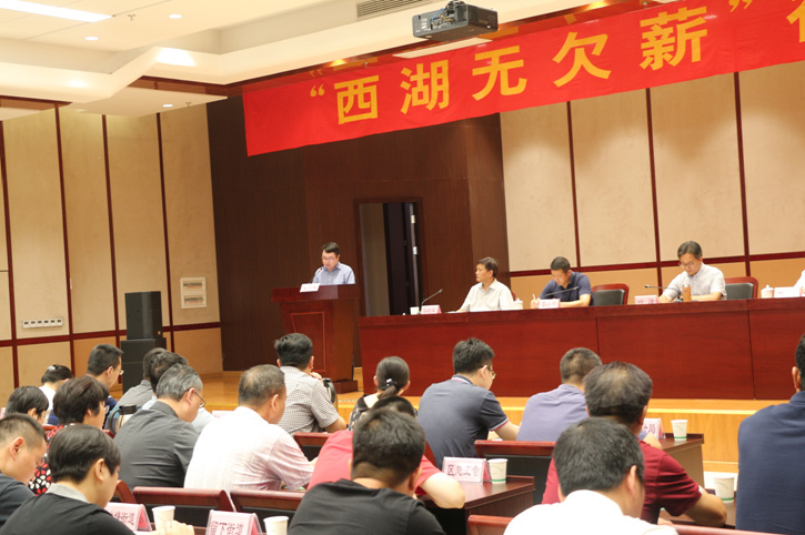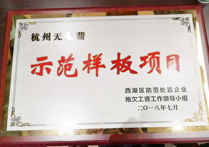 2018年7月25日,在“西湖无欠薪”行动推进会中,三丰建设副总经理方跃飞同志作为示范样板项目代表发言,他倡议施工企业切实履行社会责任、维护劳动者权益、构建和谐劳动关系。会上,公司杭政储出[2016]11号地块商务(集团总部)用房项目、双浦单元R22-A10地块居住区级公共配套服务设施项目,被正式授牌为西湖区“无欠薪”示范样板培育项目。