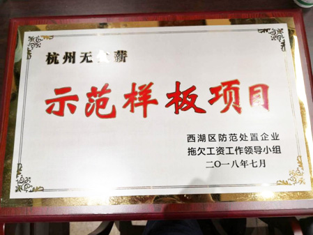 2018年7月,在“西湖无欠薪”行动推进会中,本工程被正式授牌作为西湖区“无欠薪”示范样板培育项目,并顺利通过2018年7月至12月的区、市、省各级“无欠薪”检查,项目实行的“八本台账”及“无欠薪”工作管理台账实施手册目前已作为西湖区“无欠薪”工作的实施标准在全区施行。