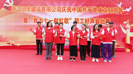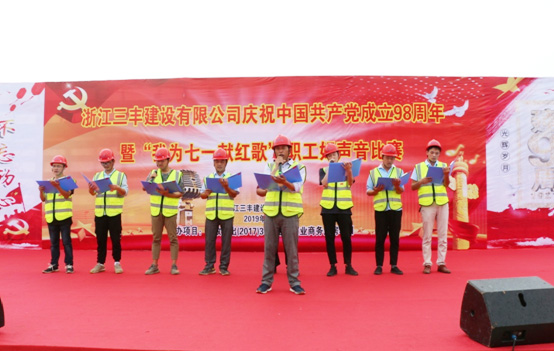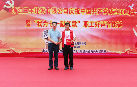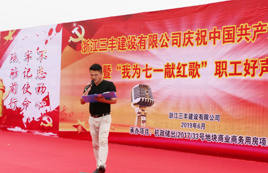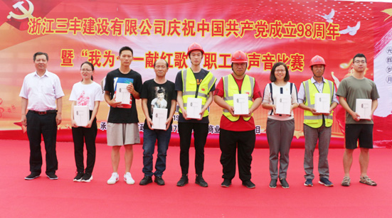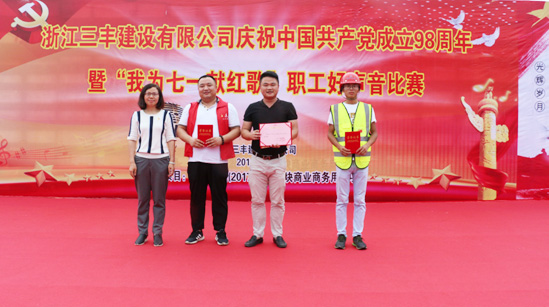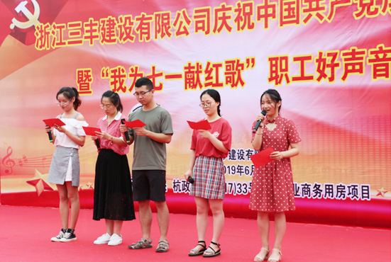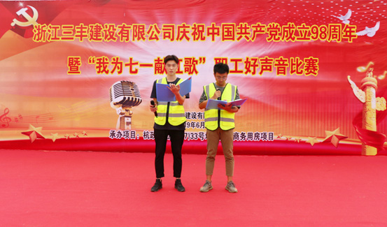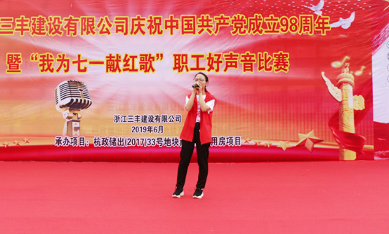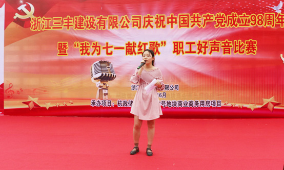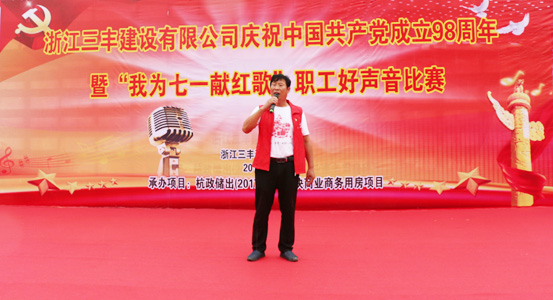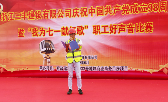 为庆祝建党98周年,弘扬红色文化,铭记红色历史,讴歌党的丰功伟绩,歌唱祖国和美好生活,6月29日下午,浙江三丰建设有限公司在杭政储出[2017]33号地块项目部举办“我为七一献红歌”职工好声音比赛,共10个部门(项目部)、15组选手参加了比赛。公司党总支副书记、副总张海建、副总方跃飞及公司部门负责人担任本次比赛的评委。总师办副主任吴凌燕担任主持。