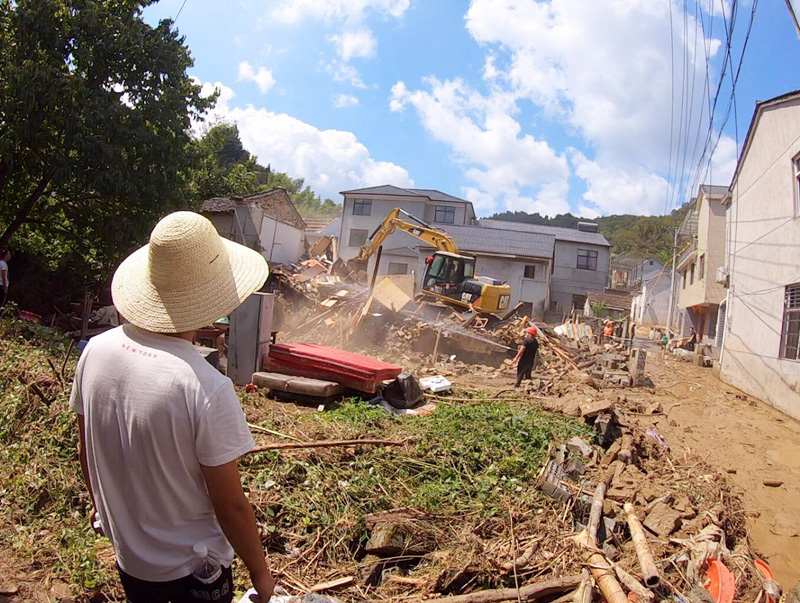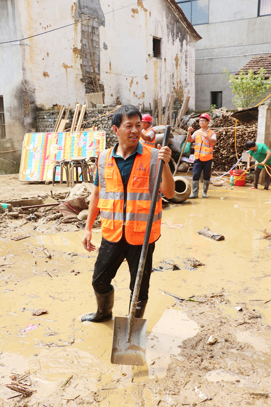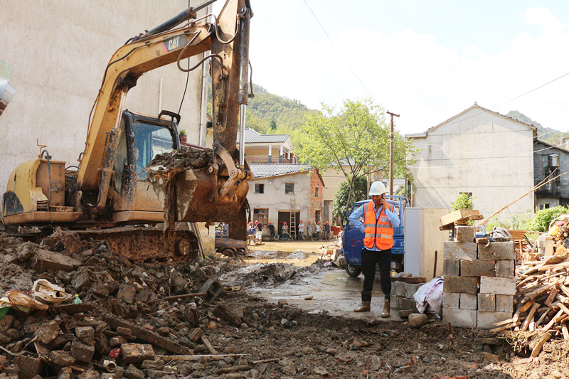 情牵家乡,心系灾情。范志军是公司临政储出(2018)5号地块(人才公寓)项目的负责人,他是土生土长的临安人。早在抗击台风“利奇马”期间,范经理就第一时间捐款捐物,为家乡临安伸出灾后援手。而此次救灾,公司抢险突击队的主力队员及机械设备主要由范经理人才公寓项目部抽调,范经理本人更是亲自拿起铁锹冲在抢险第一线。我公司救援突击队负责清理的老坞村片区内因山洪冲击,几处危房摇摇欲坠,严重威胁村民安全。在接到上级拆除危房的命令后,范经理不顾个人安危,立马亲自指挥挖掘机清理。这是一名三丰人在大灾大难前的觉悟,也是一个临安人对家乡深深的热爱。