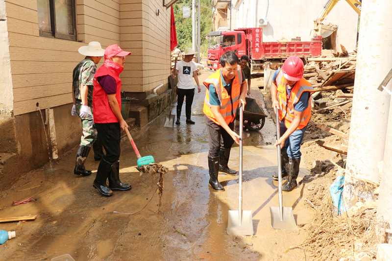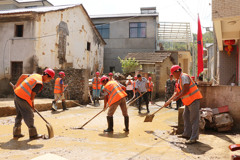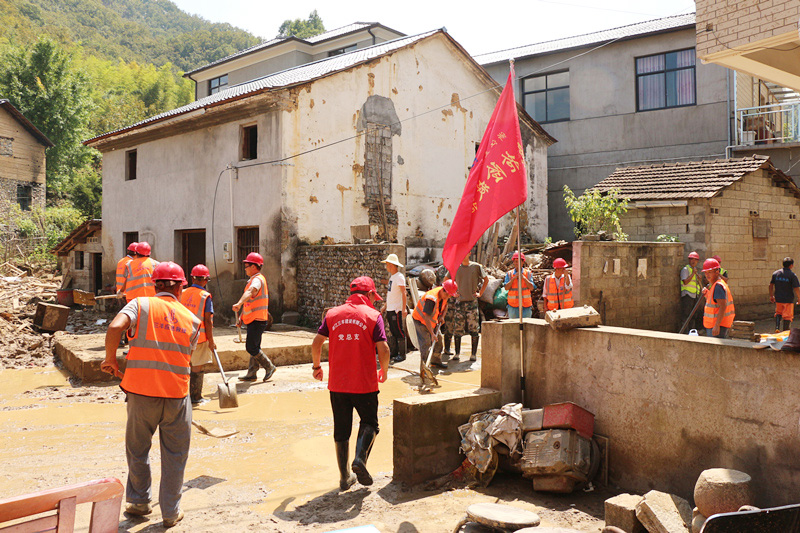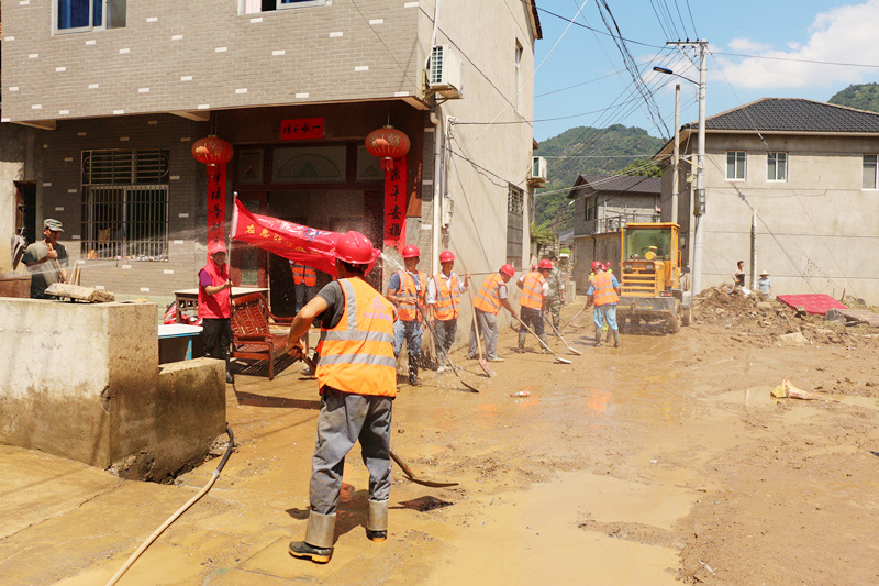 灾情如令,众志成城。公司救援突击队在到达老坞村灾区后,随即接受上级任务安排,逐户巡查排除危房险情,逐片清理打通被埋村道。朝阳下,鲜红的浙江三丰建设有限公司应急救援突击队队旗猎猎作响;汗水中,伴随着机械轰鸣队员们高喊口号铿锵有力。队员中,项目的施工员此时是指挥挖掘机清障的抢险尖兵,昨天还是钢筋工的老王,现在拿起铁锹一寸一寸将村道上的淤泥铲除。队员们冲锋在前,用自己的身躯与手中的铁锹为当地村民筑起一道坚不可摧的“防洪堤”。