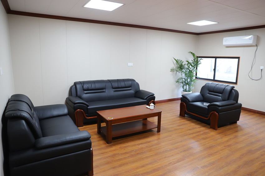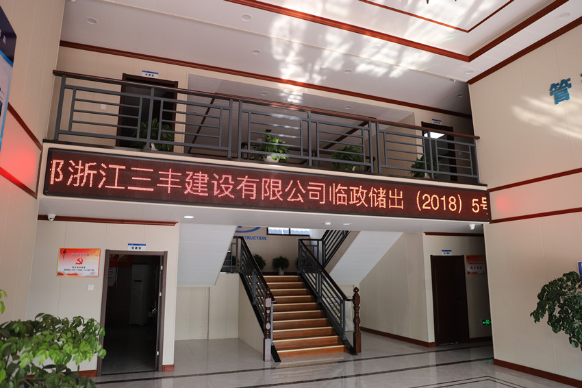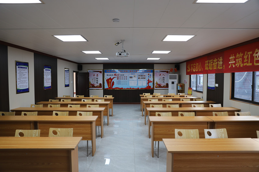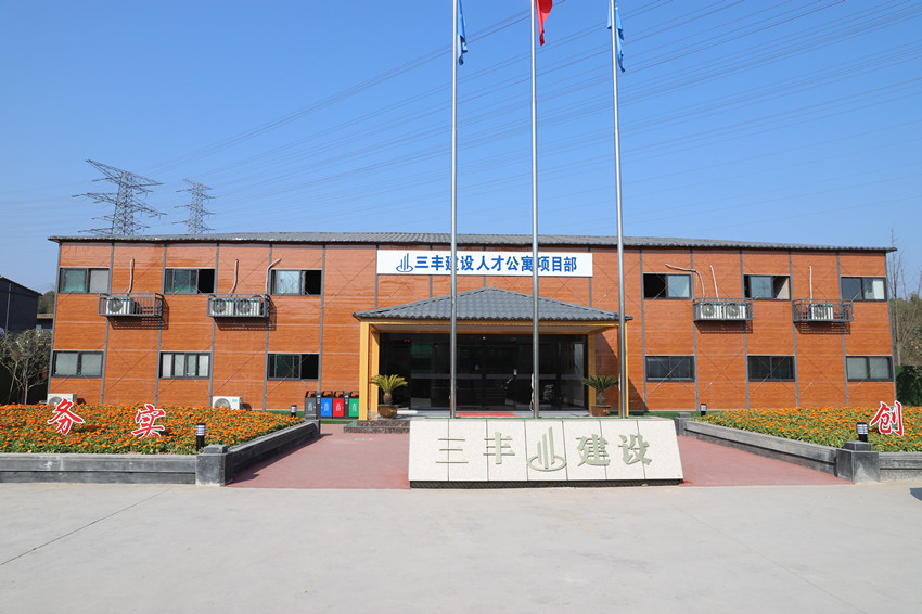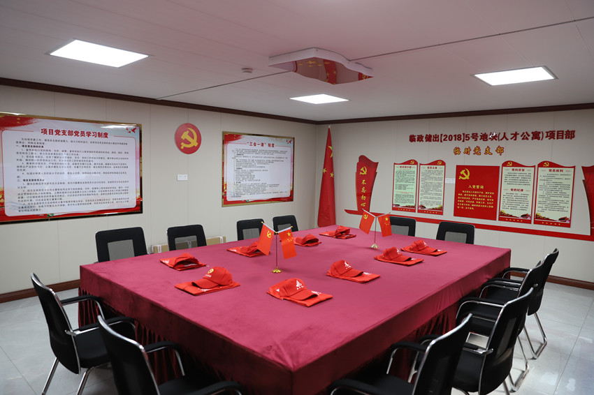 人才公寓项目办公楼采用内廊式布局,门厅配备感应玻璃大门、大型LED显示屏、吊灯等,所有房间都采用饰面板及吊顶装饰,项目部积极响应公司“厕所革命”号召,采用箭牌感应洁具及高档装修将项目部厕所打造成了公司又一个“星级标杆厕所”。此外,办公楼内的会议室、民工学校、党建室、会客室等的装修布置标准在公司甚至全市建设工地范围内都处于前列水平。