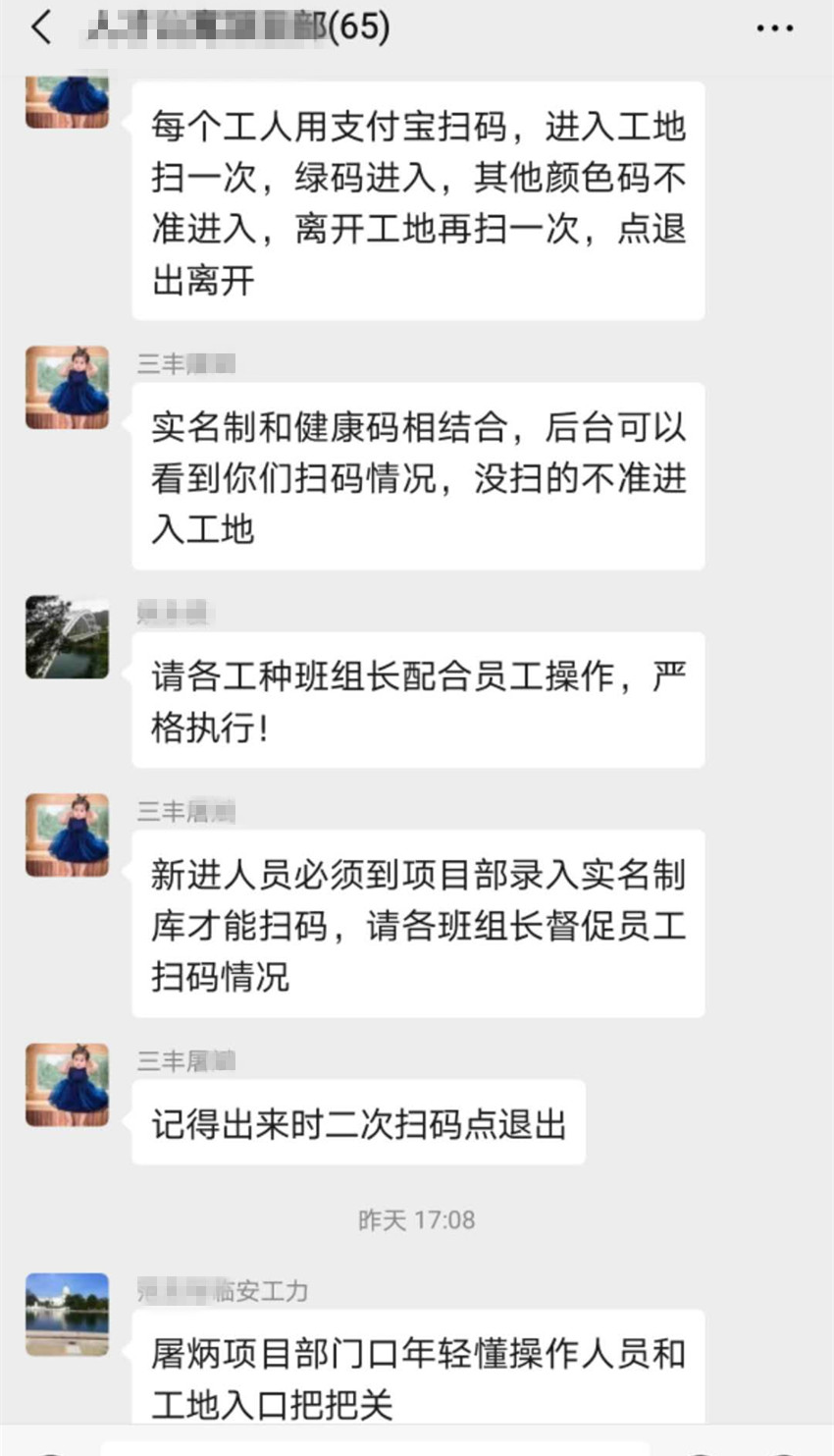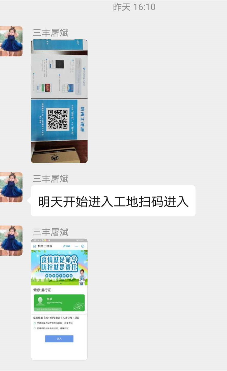 为充分发挥“杭州健康码”赋能企业复工复产作用,公司严格落实杭州市建委相关精神,将“杭州健康码”与建筑工地实名制管理相结合,通过“杭州工地通”一次性采集进场人员健康码状态及人员实名制到岗情况。要求进入施工现场所有人员进入项目部及施工现场时,均通过手机支付宝扫描该二维码,实现实名制应用系统身份认证与“杭州健康码”信息比对,确认人员健康码为绿码,信息无误方可进入施工现场。人员离场时,再次扫描该二维码,经系统信息比对后离场。