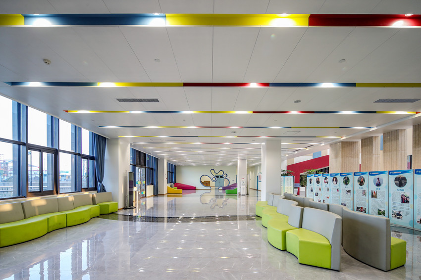 之江新城青少年活动中心,位于之江度假区江涵北路与龙心路交叉口,为单幢多层建筑,地下一层,地上五层,为公共建筑,总建筑面积为18122.4㎡。整个大楼主要采用简约、概念式装修风格风格,其中大厅采用落地式大窗设计,整个大堂通透明亮。童玩空间宽敞明亮,颜色搭配清新富有童趣,波浪曲线流畅优美有层次感,点缀各类射灯营造了行云流水如同梦幻般的星空景象。