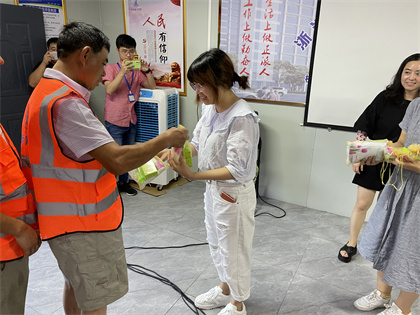 傍晚时分,西湖区总工会、双浦镇总工会及三丰集团工会负责人为民工发放了防暑慰问品,为在高温天仍坚持工作的民工兄弟们送去工会的关怀。