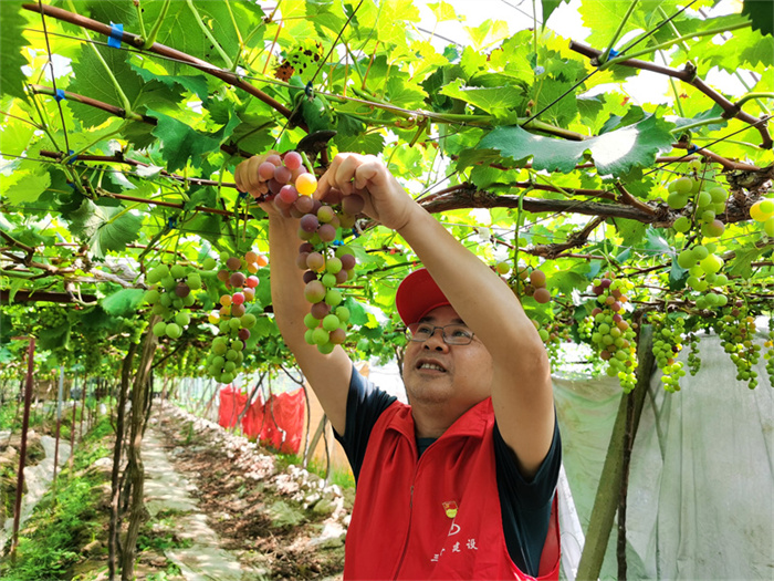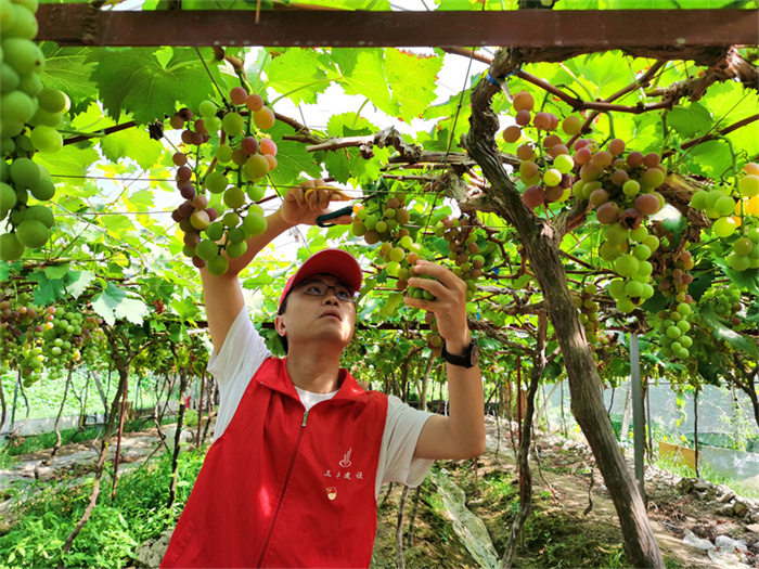 望着阳光下晶莹剔透的果实,志愿者们不怕热、不怕累,拿着剪刀便开始忙碌起来,他们三两一组,瞅准成熟的葡萄就咔擦一剪,采摘、包装一气呵成。葡萄园内到处可见他们辛勤劳作的身影,烈日下的红马夹是最美的风景。