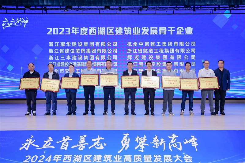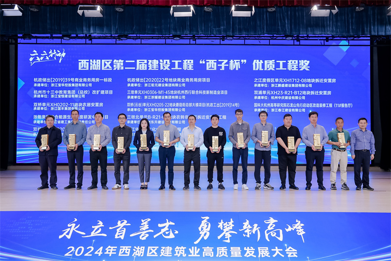 大会对西湖区第二届建设工程“西子杯”优质工程奖以及2023年度各类先进企业、现代化示范企业进行了表彰。三丰建设集团荣获2023年度“西湖区建筑业骨干企业”和“西湖区建筑产业现代化示范企业”称号,承建工程双桥单元XH0202-19地块农居安置房荣获“西子杯”优质工程奖。