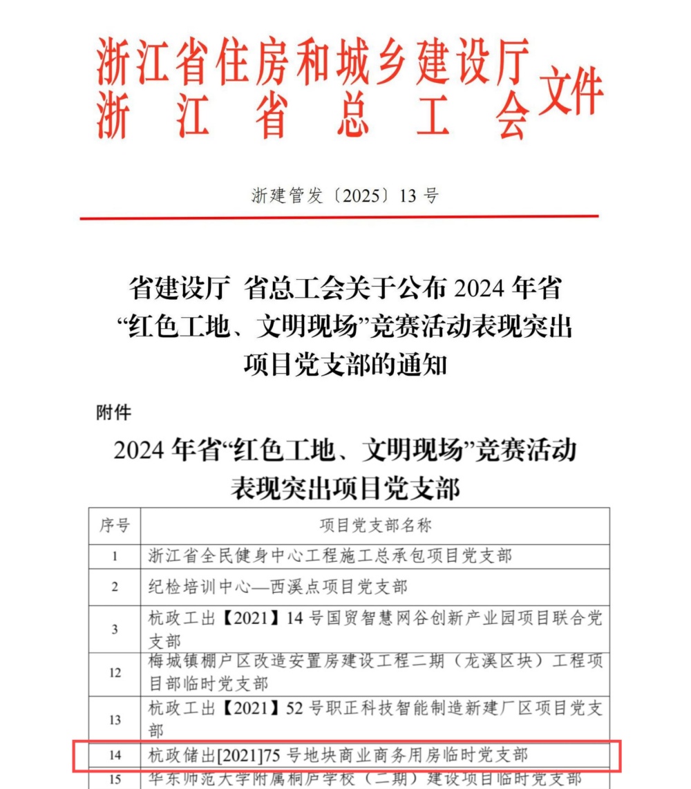 杭政储出【2021】75号地块商业商务用房项目临时党支部通过建立“廉洁学堂”、“阳光工程示范点”特色文化阵地,以党建促发展、借力发展促行动、落实行动见成效,全面开展项目廉洁活动。临时党支部带领项目部将技能创新活动的浪潮推向项目现场纵深发展,成立“党员创新课题攻关小组”,举办“创新比武”、“立功竞赛”等活动。此外,临时党支部还组织了防汛抗台应急队参加防汛抗台行动,“三丰力量护航亚运,党员先锋热血添彩”义务献血活动,“战高温、保建设、迎亚运”高温慰问活动、“不忘历史革命,体验红色精神”主题党建学习活动等。临时支部还与西湖区双浦镇镇政府总工会等在春节组织留杭民工共度春节等活动,并接受了媒体采访,为民工在寒冬带去党组织的温暖。
