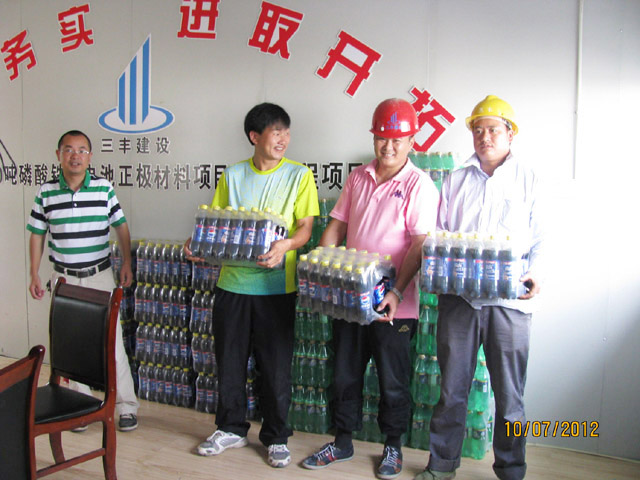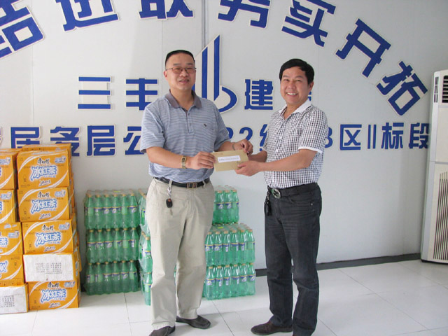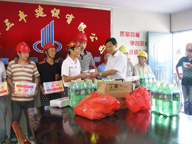为加强夏季高温天气作业的劳动保护和安全生产工作,2012年7月3日至16日,我公司由领导带队,党支部、工会及部门负责人参与,对所施工的二十余个项目部和下属单位的作业人员进行了为期两周的高温慰问活动,发放了饮料、毛巾、香皂、防暑药品等慰问品和慰问金。