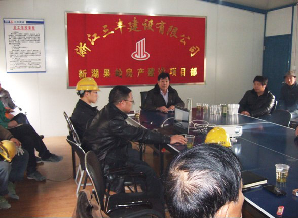 在会议室,公司副总兼总工赵建国首先对协会服务会员、协助企业加强安全质量管理表示感谢。他介绍了公司质量安全管理工作动态,进而就新湖﹒果岭项目创结构优质及标化的做法和经验进行了演示汇报。协会石宝娟工程师对本项目工地安全文明施工的好做法给予了充分肯定,对进一步加强施工机械、施工用电等的安全管理提出了改进建议。柳秘书长在讲话话中指出,为会员单位服务、为工程建设质量安全管理服务是协会的职责所在,鼓励我们多创优创标。今后将继续经常深入企业、深入工地,努力解会员单位之所难,帮会员单位之所需,希望会员单位对协会工作多提意见和建议,共同为确保杭州工程建设的安全稳定做出协会应有的贡献。