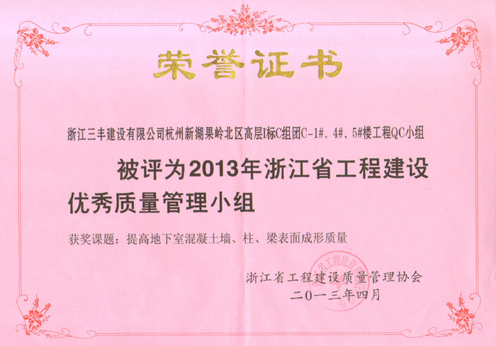 5月7日—8日,2013年浙江省工程建设优秀QC成果发布会在中北大酒店召开,全省建设系统191项优秀QC成果参加选拔。由我公司内选并经杭州市建筑业行业协会推荐选送的“提高梁、柱节点砼成型质量”课题获优秀奖(杭州市选送15项),此课题由宋家山新湖果岭C组团高层项目部研究实施。公司总师办吴凌燕主任工程师、项目部毛俊杰工程师参加了本次会议。