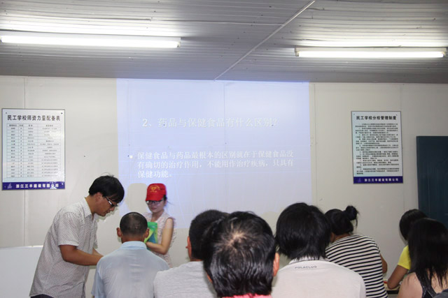 此次药品安全进工地活动由市建管站、省执业药师协会及我公司联合举办,晚上活动尚未开始,就引来了许多已下班的工人前来听讲。药师协会的老师为大家声情并茂地讲述了许多如何鉴别各类药品和保健品的真伪及正确的服用方法,如何做好防暑降温和简单的一些现场护理和急救知识,并给每人发放了一本关于医药方面的实用手册。作为生产第一线的工人们,这些知识都是平时生活中经常要用到的,大家都听得极为认真,不少工人还讲述了自己目前的身体状况,请医师给出一些保养或治疗建议,老师也细心的一一解答。