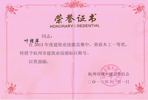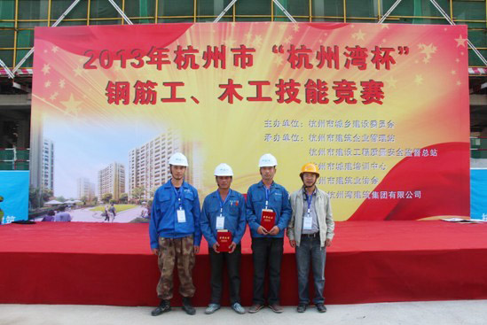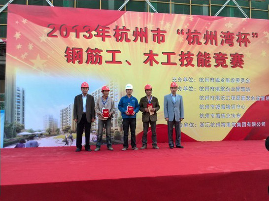 2013年10月30日至11月1日,由杭州市城乡建设委员会主办,杭州市建筑企业管理站、杭州市建设工程质量安全监督总站 、杭州市城建培训中心、杭州市建筑业协会承办的“2013年杭州市‘杭州湾杯’钢筋工木工技能竞赛”在浙江杭州湾建筑集团有限公司德信东望项目工地现场隆重举行。在经过10月31日至11月1日两天的木工理论知识讲授、考试以及现场操作技能考核,我公司参赛的三名选手,均取得了良好的成绩,其中叶煌萍同志荣获一等奖,并被授予“杭州市建筑业技能标兵”称号,吕德明同志荣获三等奖。