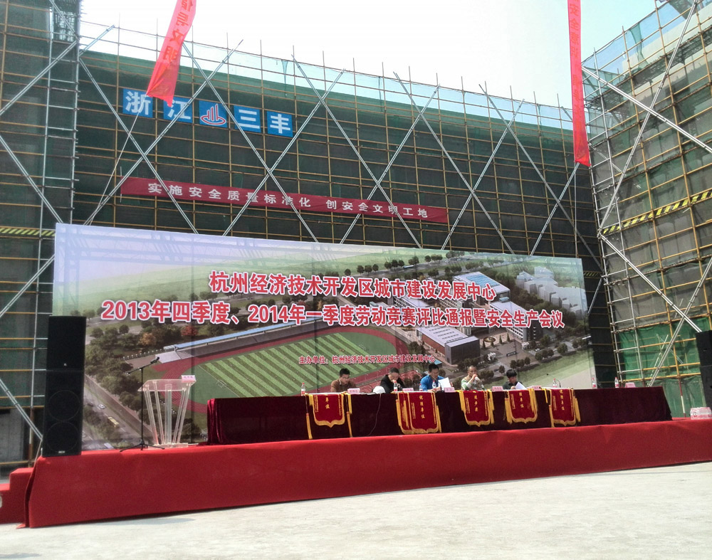 4月10日上午,由杭州经济技术开发区城市建设发展中心主办,我浙江三丰建设有限公司承办的杭州经济技术开发区城市建设发展中心2013年四季度、2014年一季度劳动竞赛评比通报暨安全生产会议在我公司承建的下沙学正中学工程施工现场隆重召开。杭州经济技术开发区建设局、质量安全监督站、城市建设发展中心等相关单位领导莅临现场并指导工作,我公司董事长葛瑞平等主要领导参加了会议。杭州经济技术开发区城市建设发展中心辖属建设项目的建设、施工、监理企业共约150人参加了本次现场会议。