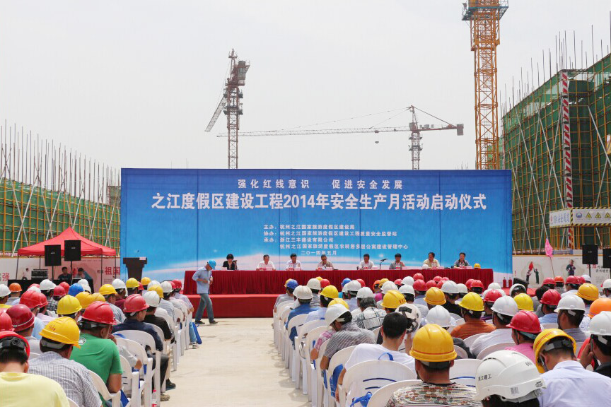 随后,省建工集团浙江音乐学院项目部的民工代表作了表态发言,之江建设局、市城乡建委的领导围绕“强化红线意识,促进安全发展”的主题发表了重要讲话,最后之江国家旅游度假区管委会吴向前副主任宣布:之江度假区建设工程2014年“安全生产月”活动正式启动。