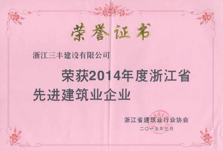 日前,浙江省建筑业行业协会召开四届四次理事会暨四届四次常务理事会议,会议通报表彰了2014年度浙江省先进建筑业企业,我公司再次被评为浙江省先进建筑业企业。