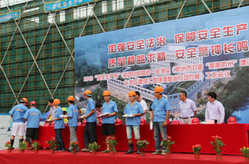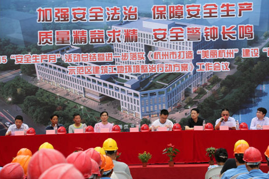 2015年7月21日上午,公司在之江发展大厦项目部现场举办了2015“安全生产月”活动总结暨进一步落实《杭州市打造“美丽杭州”建设“两美浙江”示范区建筑工地环境整治行动方案》工作会议,之江旅游度假区建设局杨杭生副局长、质量安全监督站站长祝峻、市质量安全管理协会陈国良教授等领导、专家应邀参加会议,公司领导葛瑞平、吴士南、陈银顺、赵建国、方跃飞、张海建及各项目部负责人和主要管理人员100余人参加了本次大会。