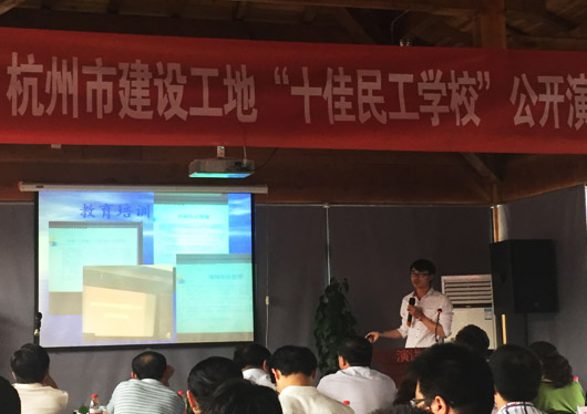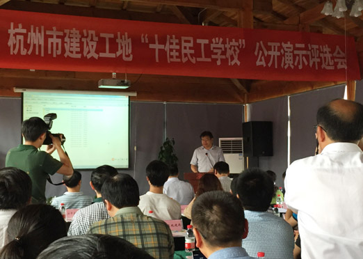 公司演示代表赖津立通过PPT的形式主要围绕特色办学、激励学习、关爱民工、营造温馨等方面来展开阐述。民工学校坚持“讲特色、讲内容、讲实效”的教学理念,广泛收集教学素材,精心编辑教案,严密组织课堂问答,真正达到使民工入目、入耳、入心的教育要求。民工学校开办以来,坚持做到“每月有主题、每周有活动”,除了课堂教学活动以外,项目部还运用各种形式组织民工参加知识竞赛、技能比武、安全质量月图片展、联合社区在传统节日开展文体活动、邀请社区医疗队进工地、为民工兄弟免费放映露天电影等活动,使民工既学到了知识,提高了技能,又能形成比学赶帮、相互促进的学习氛围。最终转塘镇沈家弄村等九个村农转居多层公寓配套公建建设(方家畈A-R21-16地块)民工学校入围2014年度杭州市优秀民工学校候选名单。